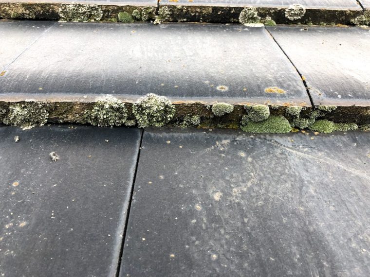 上の写真を見て分かるように瓦の先(小口)にコケがたくさんついています、これは水の通りを邪魔しているので雨漏りしやすい状態になります、瓦と野地板の間にはルーフィング材(防水)がありますが年数と共にルーフィング材も劣化して破れやすくなる為、防水自体出来ない状態になります。
