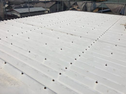 下の写真は鉄板の屋根で塩ビを巻いたものです、ボルト部分はカバーを付けていることが多いですが塗替えの場合はサビ止めやプライマーを塗った跡に新しいボルトカバーを付けて上塗りをしていくと一番いいかと思います。