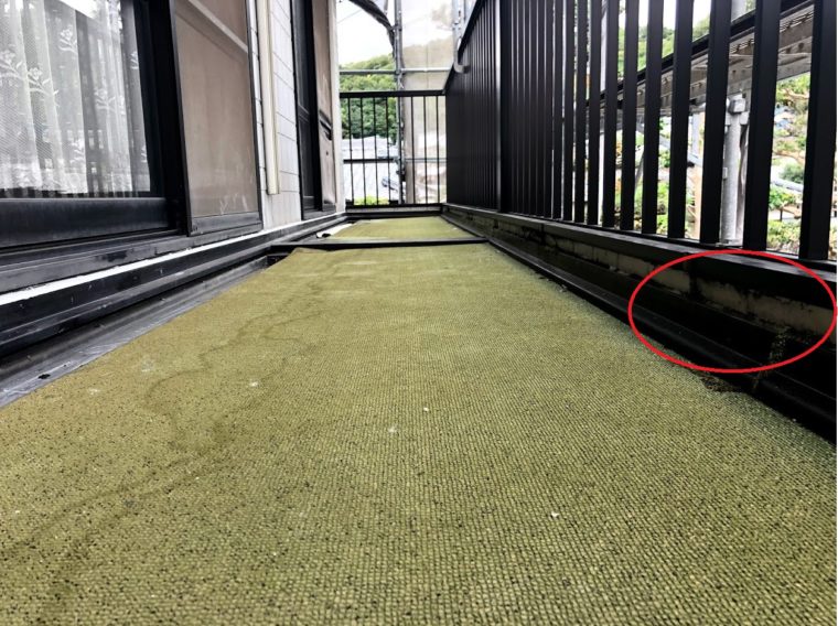 ⇧ベランダの真ん中部分が雨漏りが一番ひどかった箇所です
