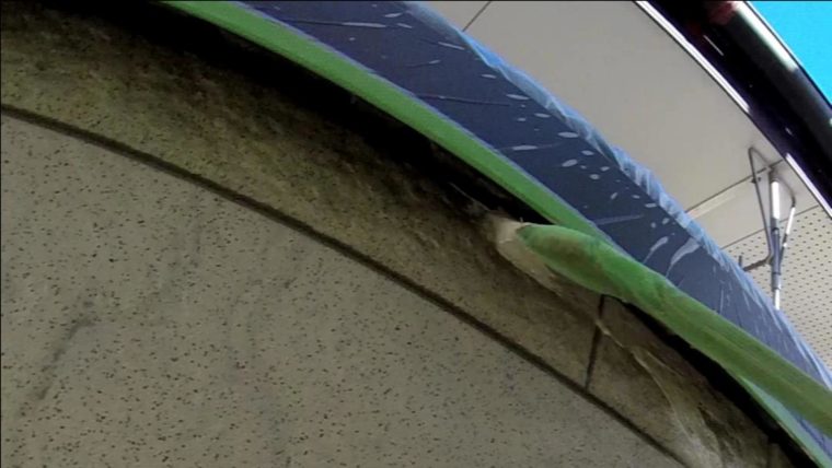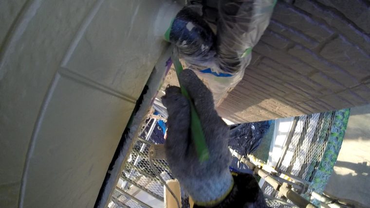 ⇧ベランダ笠木の下側へ奥まで塗装します、注意ですが、奥まで入れすぎると笠木の裏側に塗料が付くので要注意です。