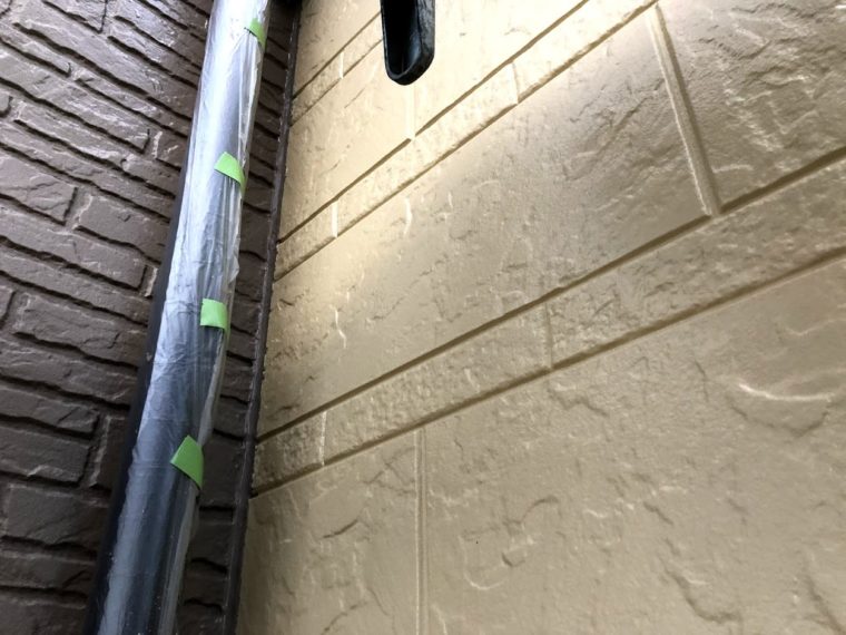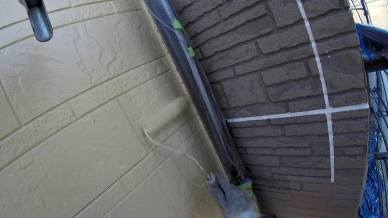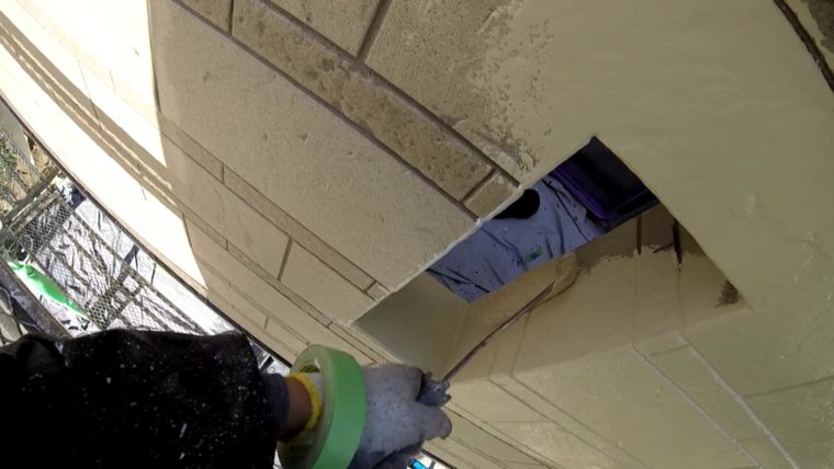 今回はベランダの外側を外壁と違った色を塗装するため、塗り分け作業です。