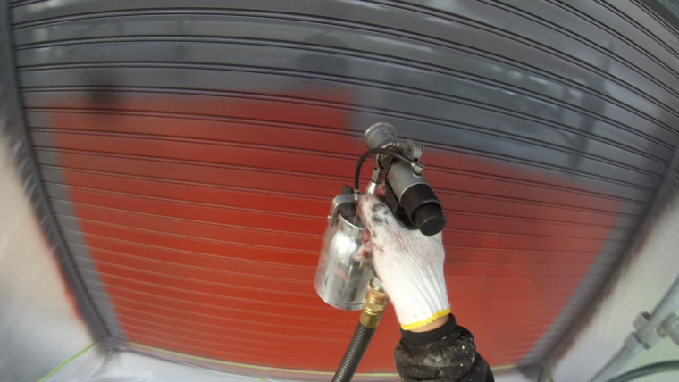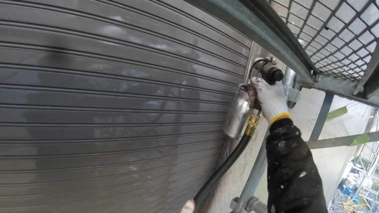 ⇧シャッターの色を調色しています、お客様のご希望で現状の色に近い色を調色させて頂きました。