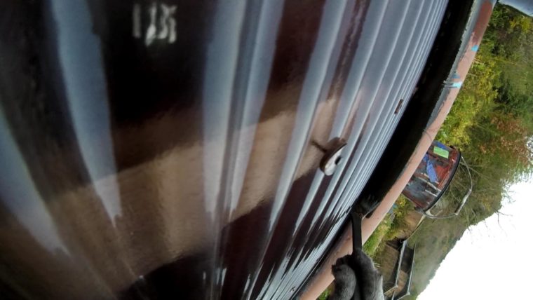 ⇧波板の上側の竪樋も塗装しました、この波板も張替えていますので、こぼさないように(;゚Д゚)