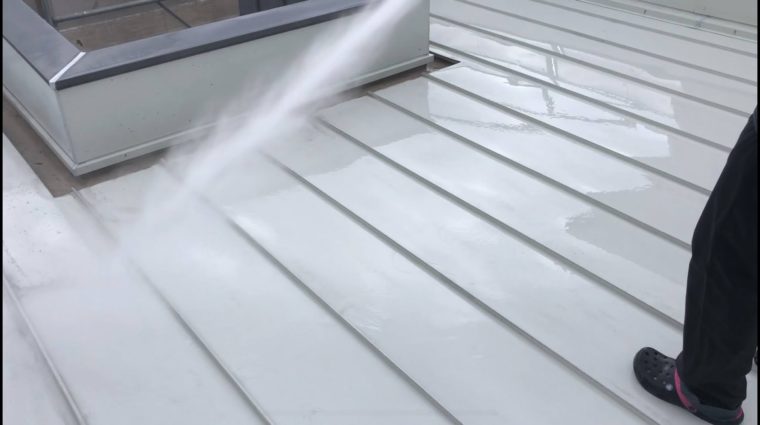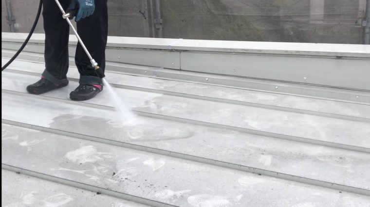 ⇧ガルバリウムの表面の汚れや劣化した表層を取るように洗浄しています。