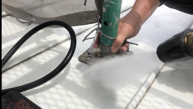 ⇧下屋根に足場ジャッキが掛かっているので持ち上げてジャッキの下も洗浄します。