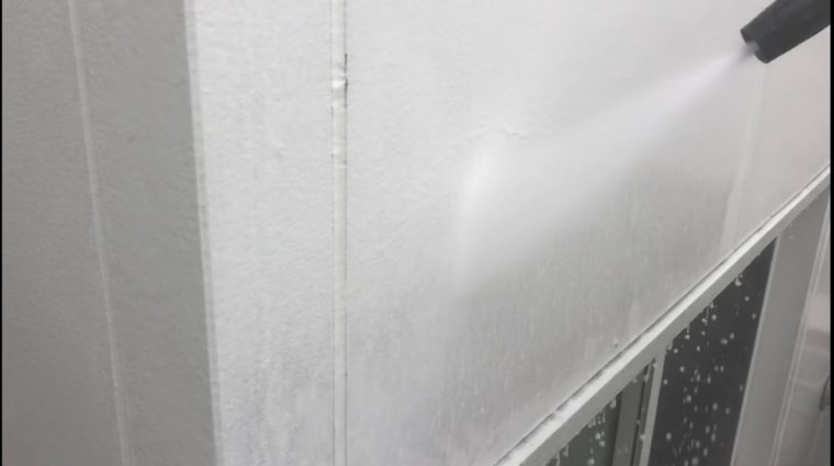 先日、コーキングの打ち換え工事も終わり、この時期なので乾燥1日でコーキングも乾いている頃合いなので洗浄をかけていきます。