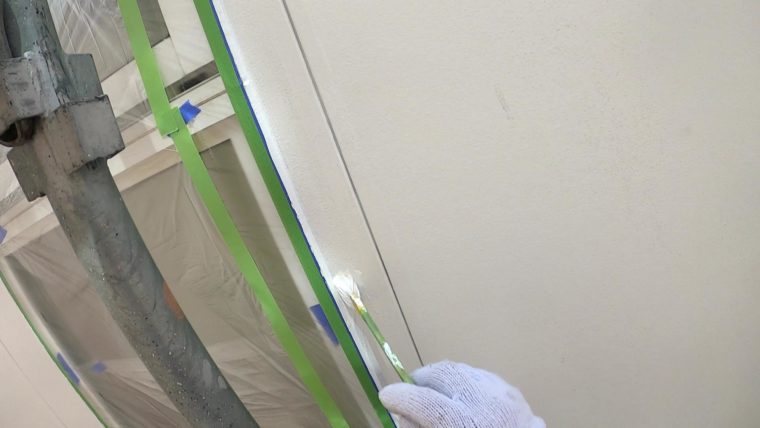 ⇧コーキング部分やローラーで入らない箇所は刷毛を使って塗装しますが、窓廻りはローラーで仕上げると塗料が養生を突き破って入ることがあるため、私たちは刷毛で塗装するようにしています。