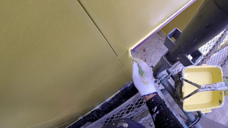 ⇧上塗りをしていきます、上塗り塗装は外壁表面を慣らしていく作業でもあるので大切です。