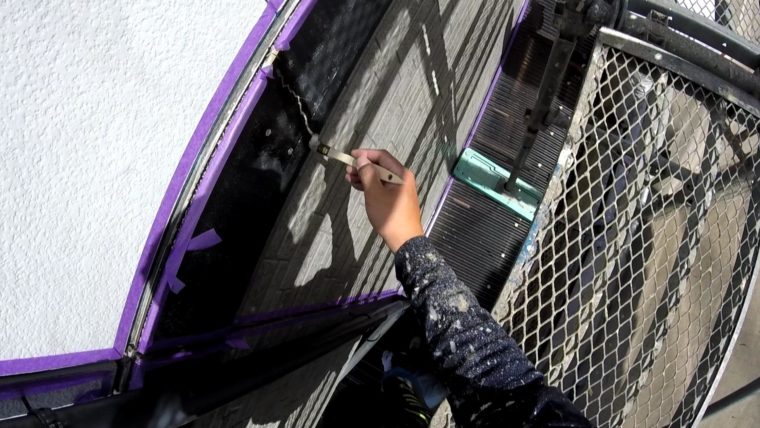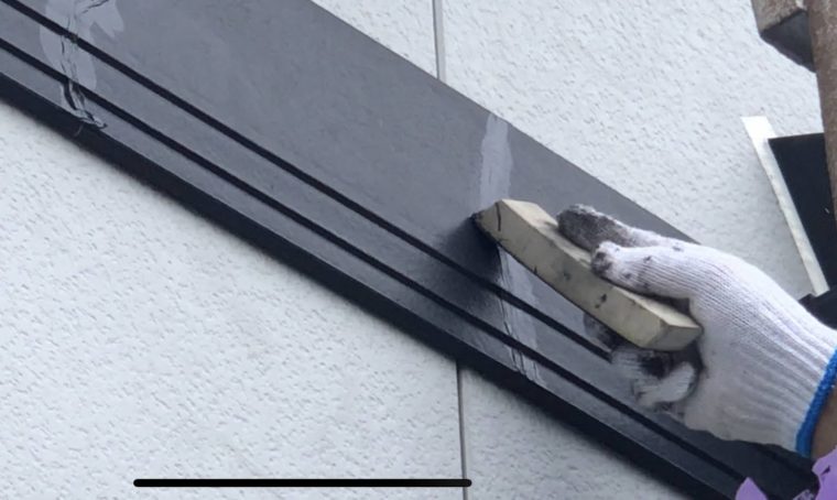 ⇧破風板のジョイント箇所には黒のコーキングを入れていきます。