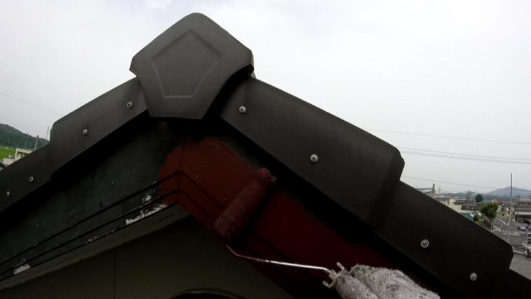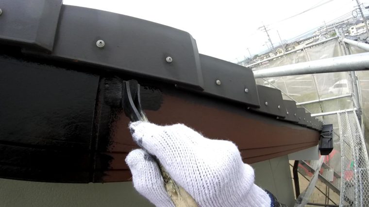 ⇧破風板の中塗りです、瓦の奥の雨がかかる範囲は絶対に塗装しないといけないので奥までしっかり塗装します。