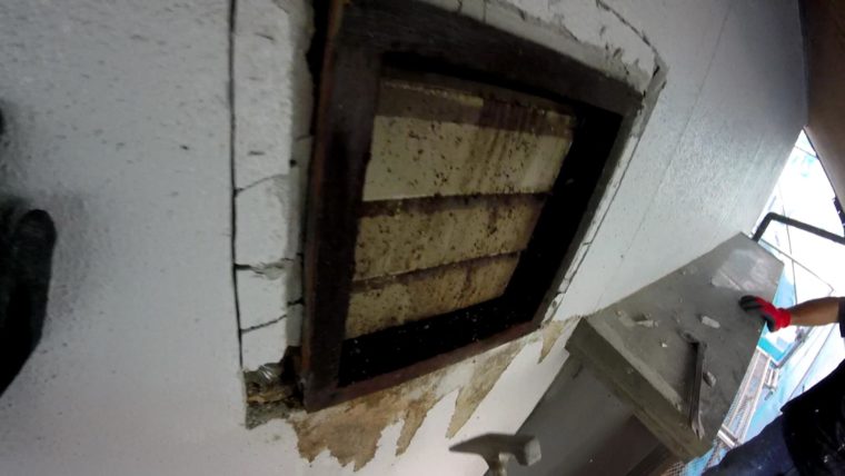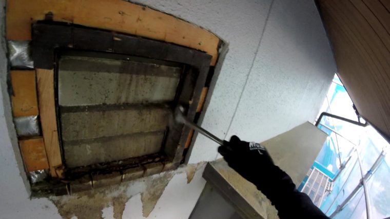 ⇧換気口が取れたら廻りのモルタル部分もバールで撤去します
