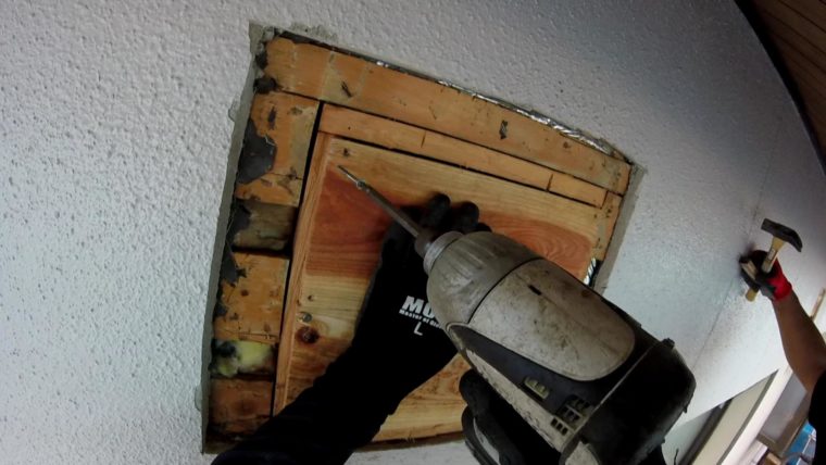 ⇧木枠があると邪魔なので切り込みを入れてハンマーで壊します、ちなみにここは台所の換気口だったので油分がすごくて、外壁の塗膜も浮いてましたので皮スキなどで撤去しました(‘◇’)ゞ