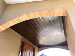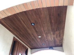 ⇧玄関の軒天は浸透性塗料で仕上げました、しっかり研磨して塗装しました。