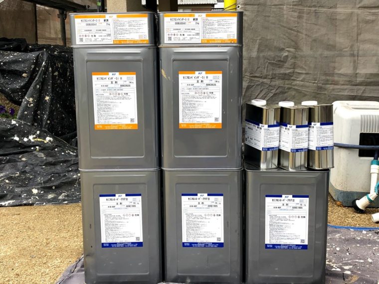⇧今回の外壁塗装の材料です、KFケミカルさんのセミフロンスーパーアクアⅡ(無機塗料)を使わせて頂きました(*^-^*)