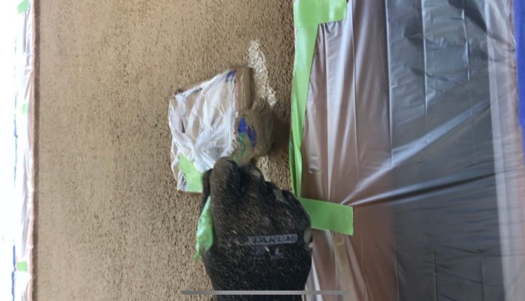 軒天はキシラデコールを塗布しているので散らせません(;´Д`)慎重に・・・⇧この塗料は骨材が入っているので(骨材とは寒水石のような石)この骨材が空気の層を含んでくれるので膨れの防止になります(*^-^*)