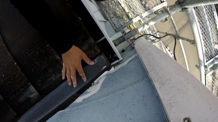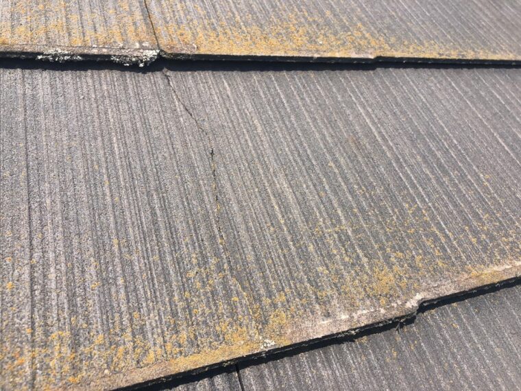 ⇧屋根の亀裂補修をします、写真では見えにくいですが亀裂で完全に割れています
