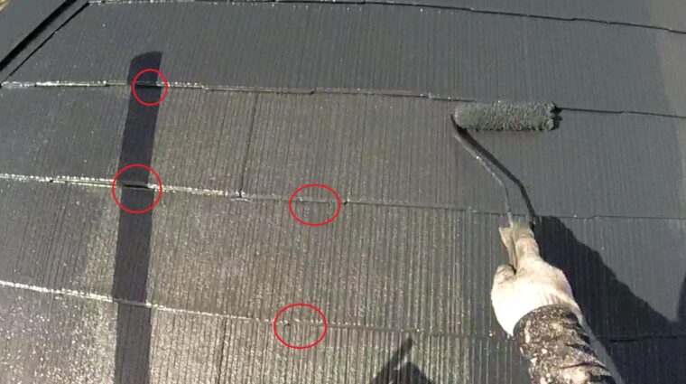 屋根は雨が直接当たる所であり、尚且つ屋根材同士の間を通って雨を排出する為、雨の出口部分を塗料で塞いでしまうと雨が逆流して雨漏りを起こすことがあります。
