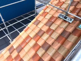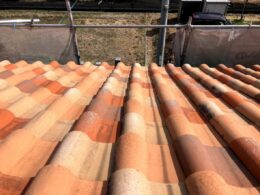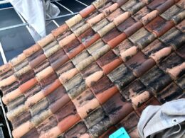 ⇧屋根は洋風の素焼き瓦でプロバンス風のおしゃれな物ですが、表面の膜がザラザラなので汚れを付着しやすく沢山の汚れがありましたが高圧洗浄で出来る限り除去させて頂きました。