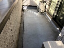 ⇧ベランダ床はFRP防水がしてありました、汚れが目立ちましたがきれいに3回FRPトップを塗装させて頂きました。
