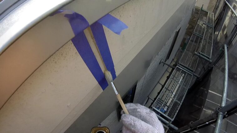⇧コーキングの密着を強くするため、プライマーを塗っています。