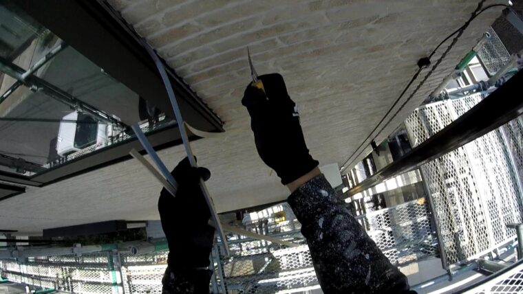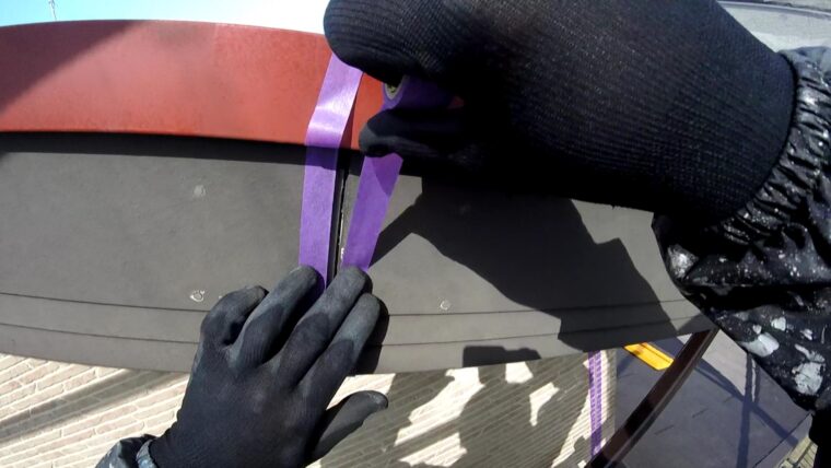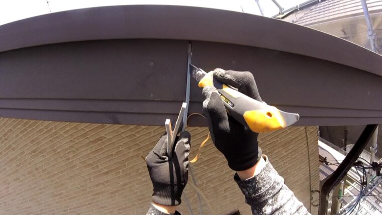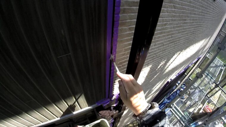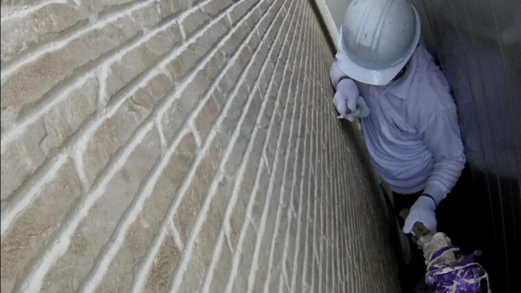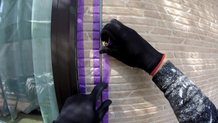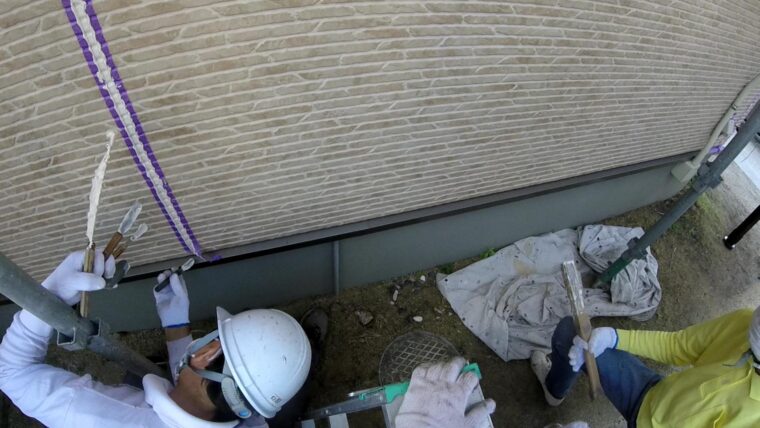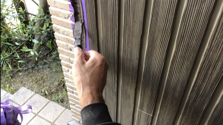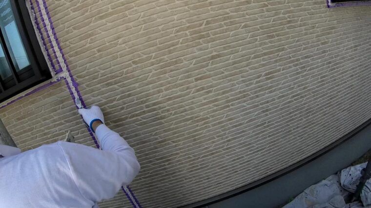 ⇧コーキングの養生をしていきます、段差がある外壁なので凹凸に合わせて養生していきます。