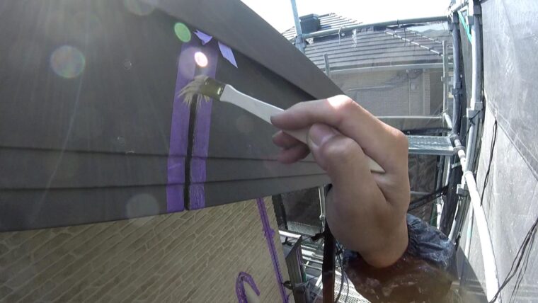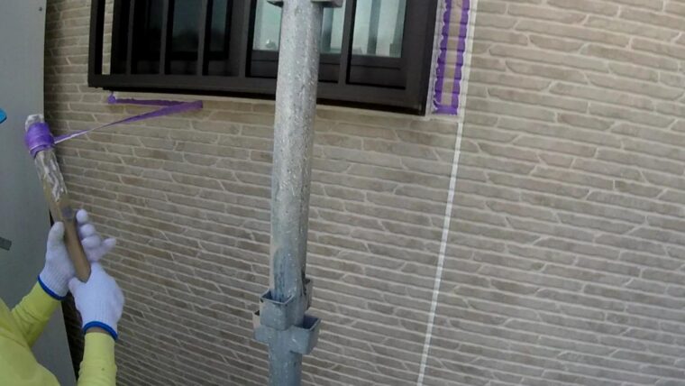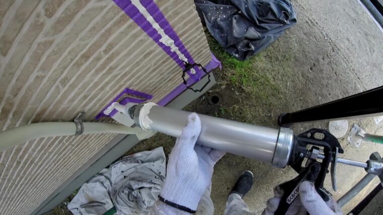 ⇧外壁の色が違う箇所はコーキングの色を変えて仕上げていきます。