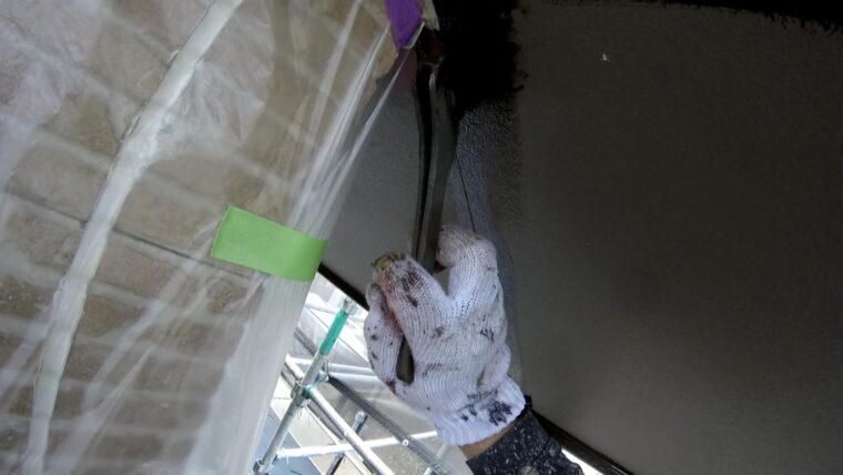 クリア塗装の場合は軒天のコーキング部分に軒天の塗料を付けれないので、刷毛で全部引いていきます。