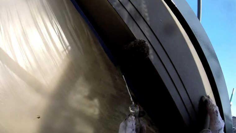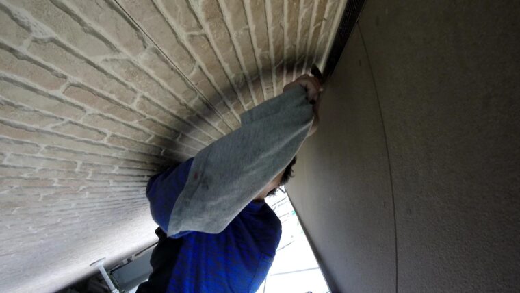 外壁はクリア塗装なので軒天の塗料が飛散しないように軒天の下に傘の様な養生をしてゆっくり塗装していきます。