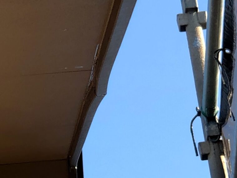⇧この部分ですが遠目から見てもくの字に変形していますが変形した物は直せないので現状より反りが出ないように軒天側と破風側の塗装で防水させて頂きました。