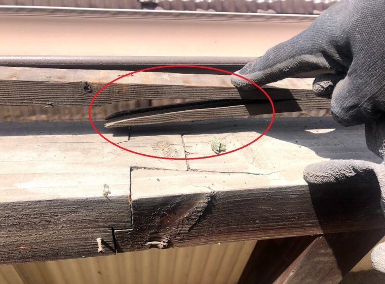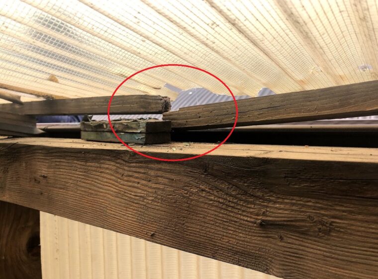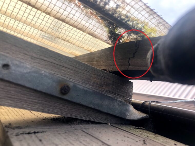 ⇧ここも亀裂はいってますね・・・(・_・;)この骨組みは垂木が細いタイプの木材を使っているので年数はもたない感じがしました。