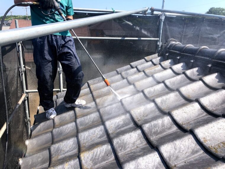 屋根はセメント瓦なのでしっかりと洗浄をして苔などをしっかり取って塗装をしないといけないので集中してやっていきます。
