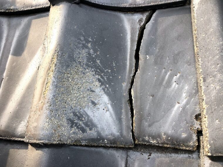 ⇧洗浄前に瓦が割れたまま洗浄してしまうと雨漏りをしてしまうのでチェックしていたら3枚くらい割れていました(;゚Д゚)