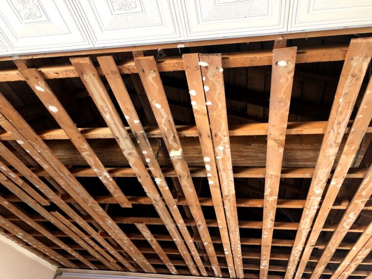 ⇧天井材を撤去して野地板に付いているボンドやクギを取って平らにします。