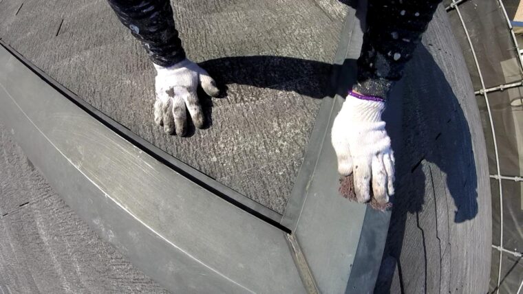 ⇧屋根廻りの金属部分の研磨で塗料の密着性を高くして剥離防止の対策をしていきます。