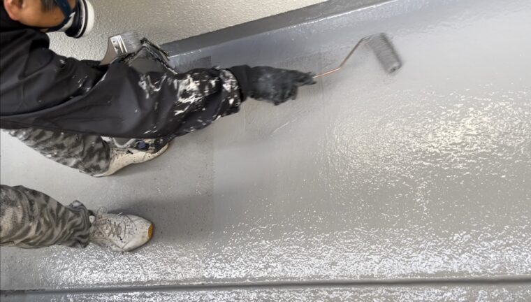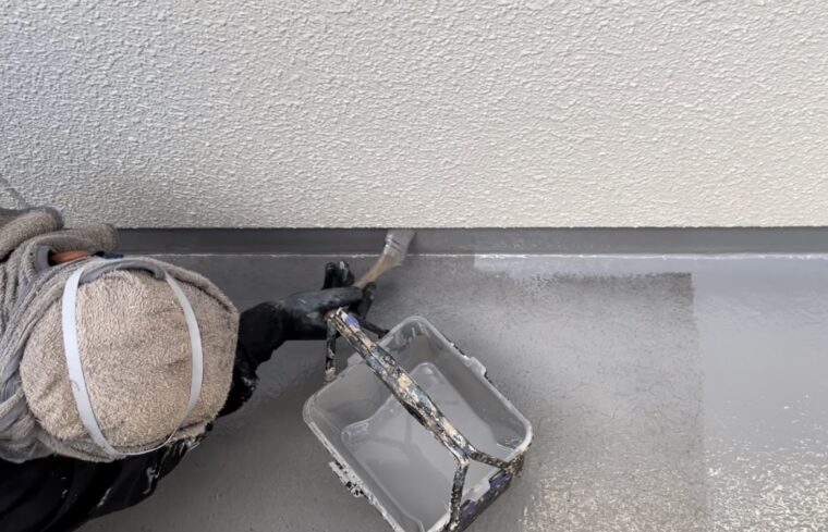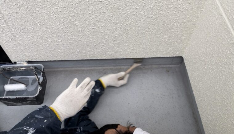 理由としては雨が跳ね返ってくる箇所まで防水をしないと意味がないので立ち上がりの奥まで塗装を心掛けています。