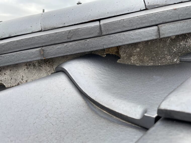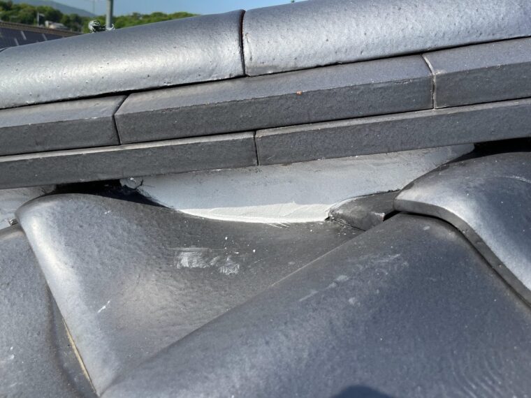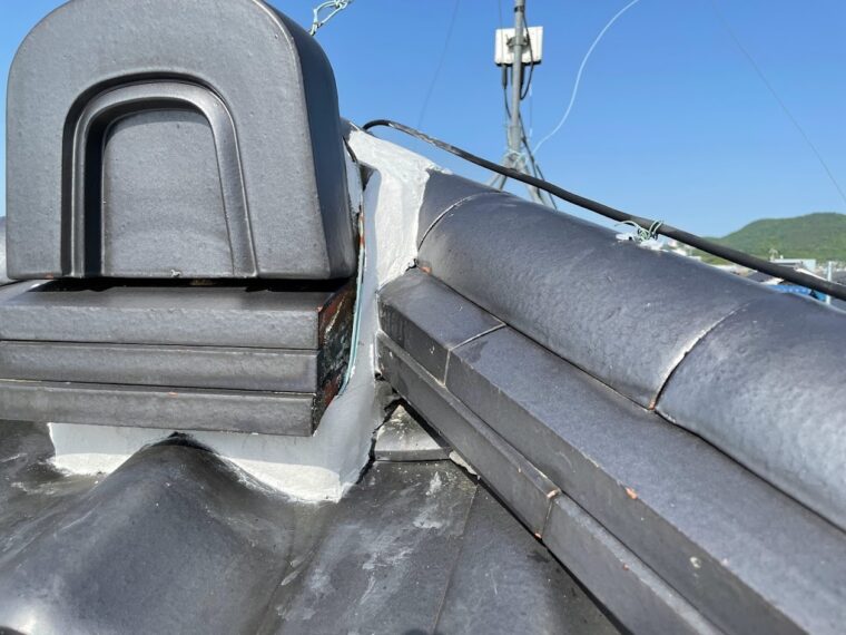 屋根の瓦の棟部分や三日月型の箇所も年数が経つと雨が瓦内部に入って漆喰や土が流れて欠けたりして雨漏りの原因にもなりますので漆喰の点検を兼ねて10年前にはチェックが必要です。