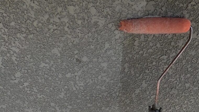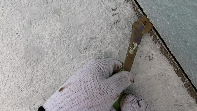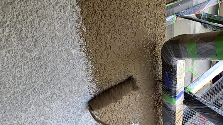 ⇧まずは下塗り、表面の骨材をポロポロ落ちないように密着させ強化させないといけないのでカチオン系シーラーをたっぷりしみ込ませて骨材を固定します