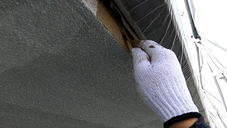 ⇧軒天破風もリシンを吹き付けて仕上げているので外壁と同じ塗料を使いました。