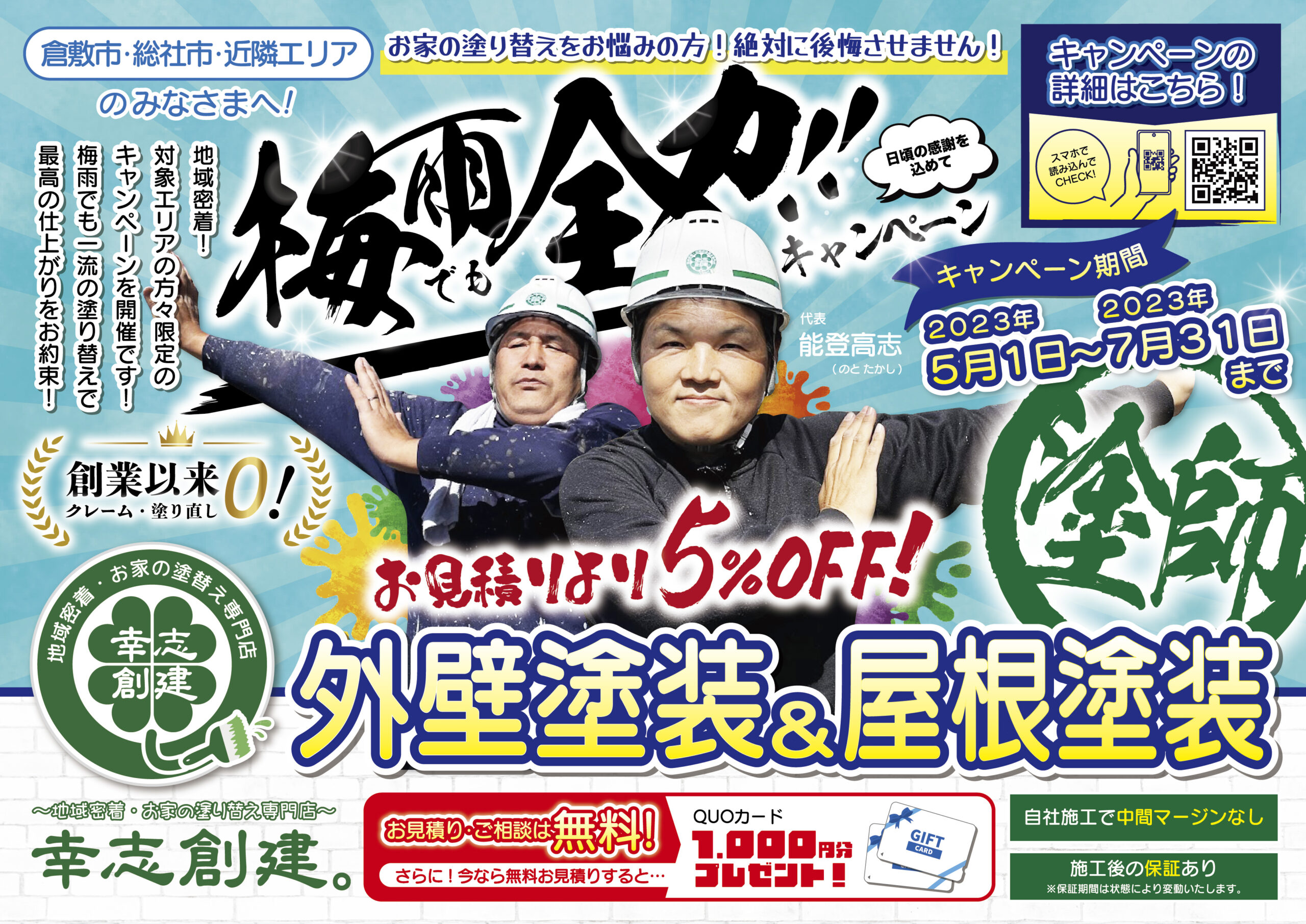 このキャンペーンチラシを見て頂いた方に、もしかすると梅雨時期に無責任な工事をするのかと言われるかもしれませんが、我々は無責任な工事なんて一度たりともしたことないから分からないのが現状です。