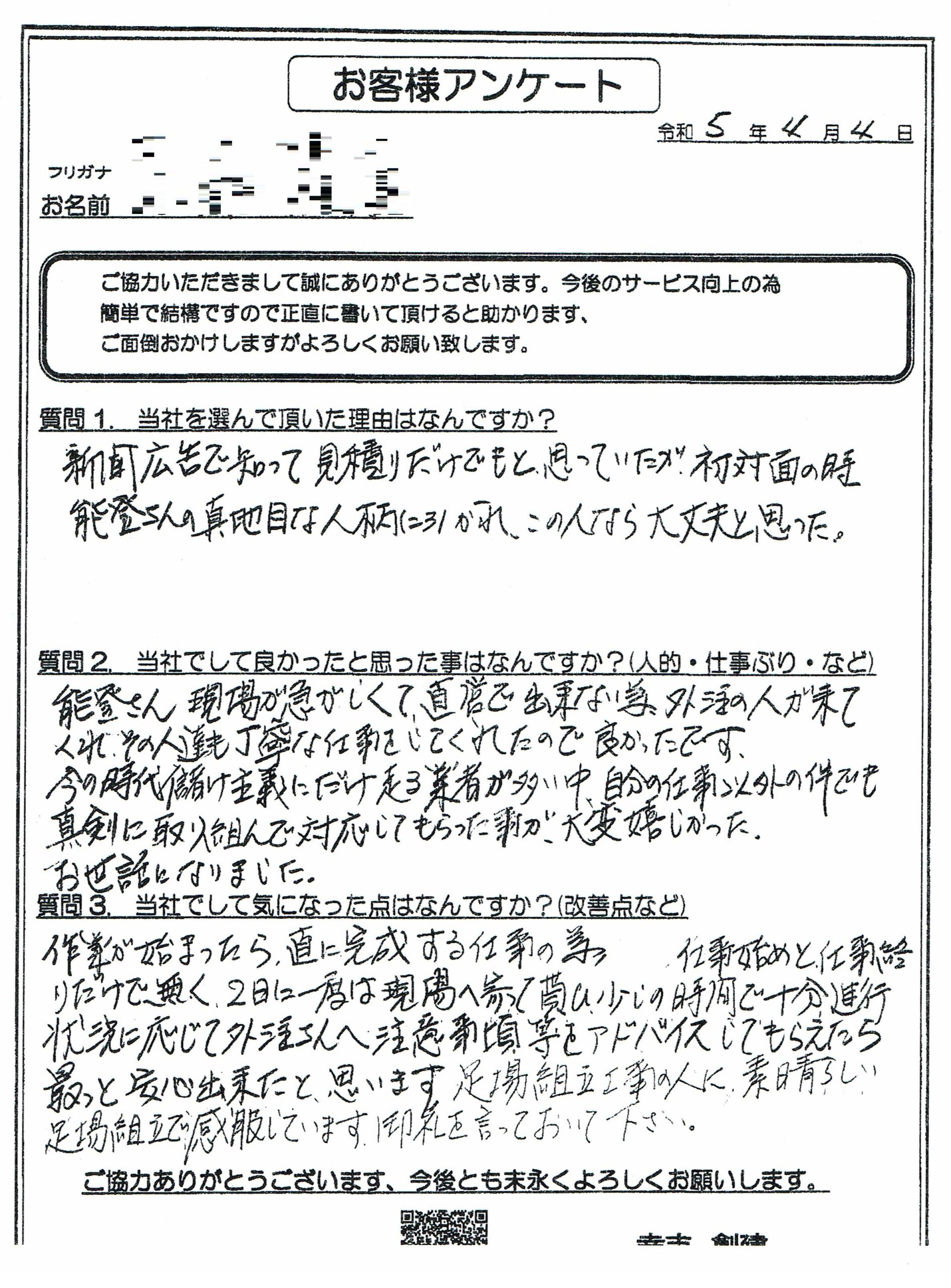 ・新聞広告で知って見積だけでもと思っていたが初対面の時、能登さんの真面目な人柄に引かれ、この人なら大丈夫と思った。
