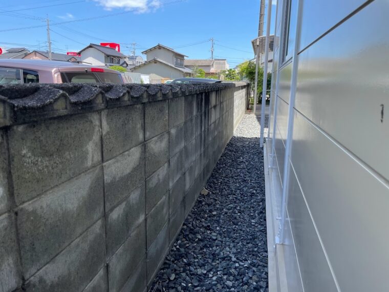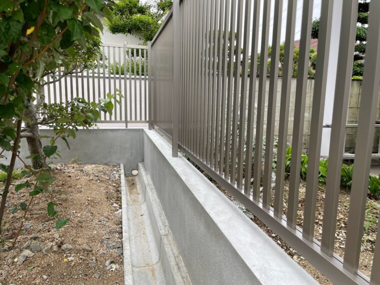 ⇩解体前は6段ほどブロックが積んでありましたが経年劣化で至る所に亀裂が生じていた為、下2段を残してフェンスを設置させて頂きました。