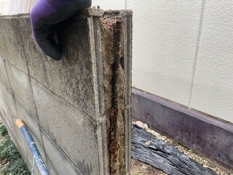 ⇩ブロック塀の解体中にセメントが全く効いてなくほぼ土で固められていました(;´Д`)
