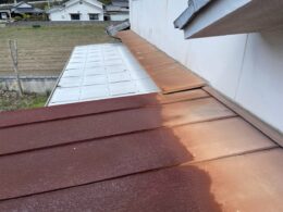 ⇧以前は廃屋の様な倉庫があるおかげで雨が逆流して雨漏りを引き起こしていたので撤去して塗装をさせて頂きました。