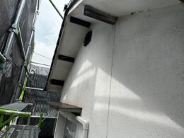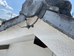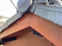 ⇧破風部分はアンテナのアンカーを無理やり付けていたせいで亀裂が酷かったのでモルタル補修後に塗装させて頂きました。