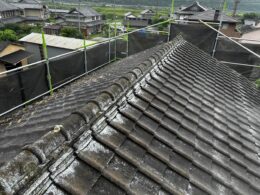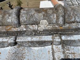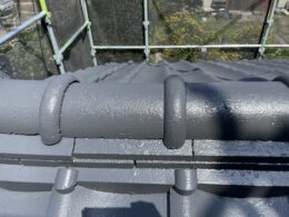 ⇧棟の瓦もコケが多く表面が弾けてい箇所もありましたが下塗りを弾性系の物で凹凸調整をして屋根塗装をさせて頂きました。