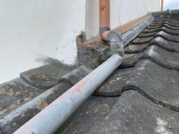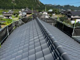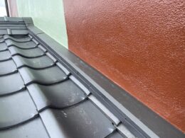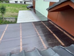 ⇧こちらの屋根は雨漏りが以前にしていたらしく原因は屋根の水切りが中に入ってないのと防水シートの立ち上がりが無く壁の中に入っていた為、瓦の撤去後に防水シートも敷き直して水切りも設置して雨が流れるようにさせて頂きました。