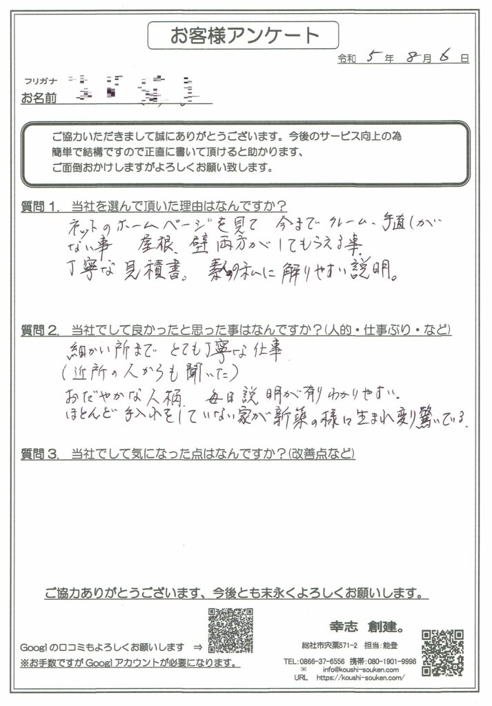 ネットのホームページを見て、今までクレーム、手直しがない事、屋根、外壁両方がしてもらえる事