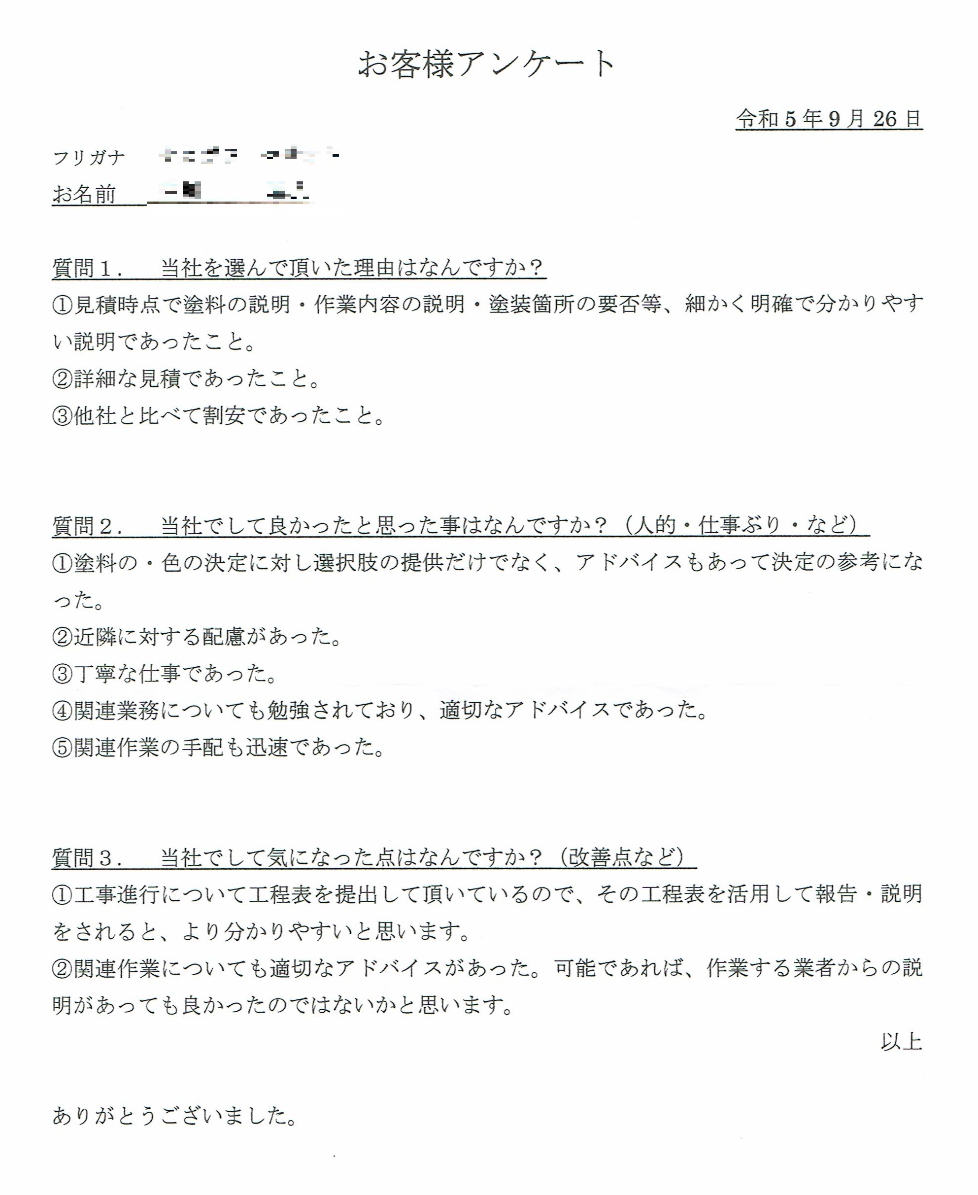 ①見積時点で塗料の説明・作業内容の説明・塗装箇所の要否等、細かく明確で分かりやすい説明であったこと。