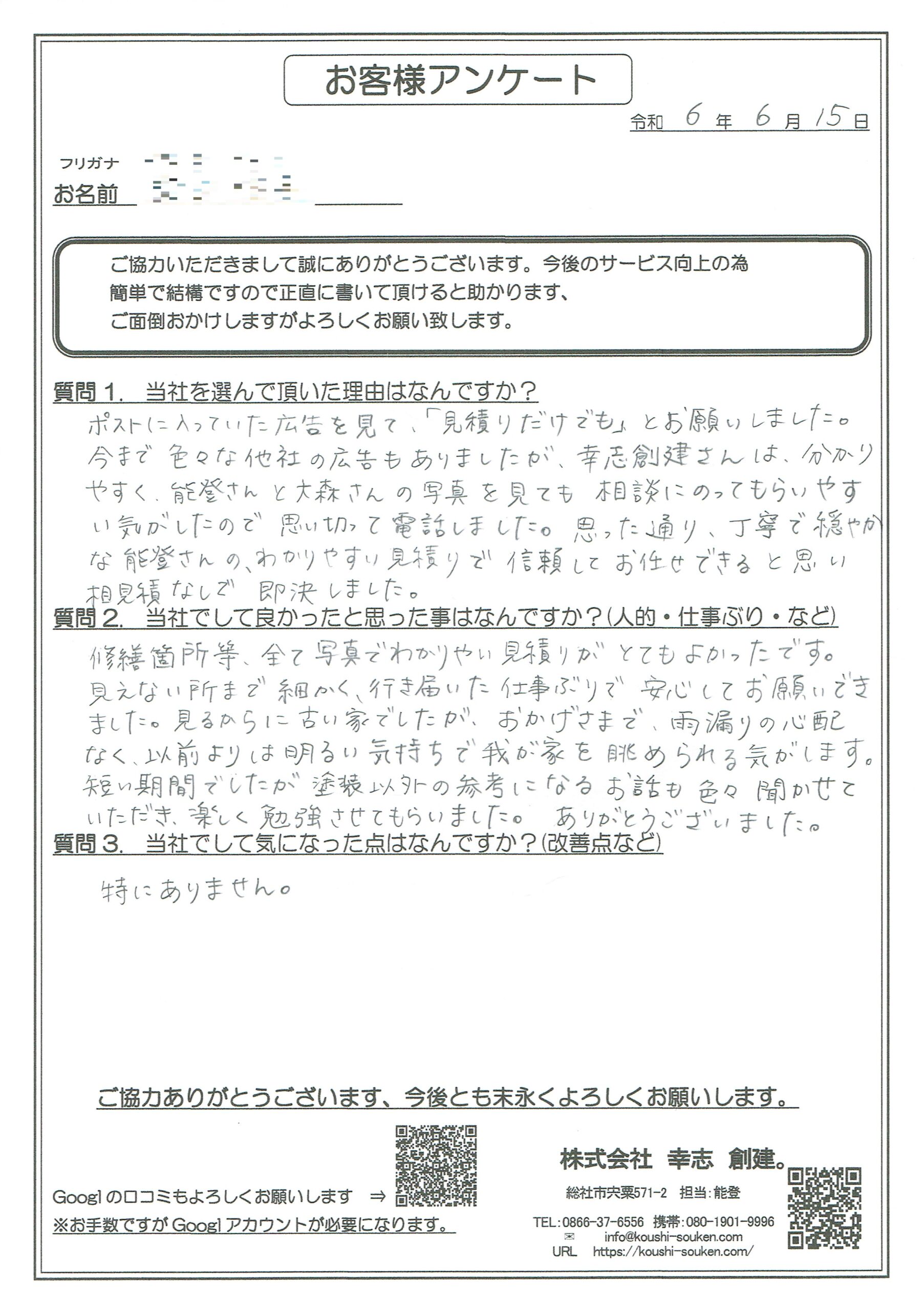 今まで色々な他社の広告もありましたが幸志創建さんは、分かりやすく能登さんと大森さんの写真を見ても相談に乗ってもらいやすい気がしたので思い切って電話しました。