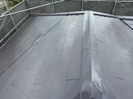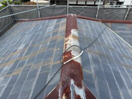 屋根を見てみると棟板金にサビが多く出ていましたので弾けてる箇所は交換の予定でしたが大丈夫そうでしたので下処理をしっかりして屋根塗装をさせて頂きました。